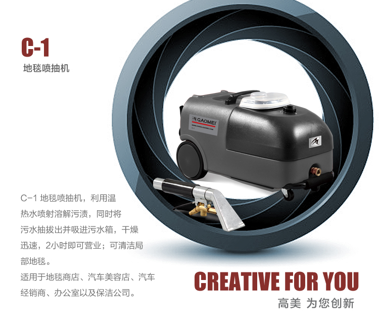 C1地毯噴抽機,利用溫熱水噴射溶解污漬,同時將污水抽拔出并吸進污水箱,干燥2小時即可營業(yè);可清潔中等面積地毯。