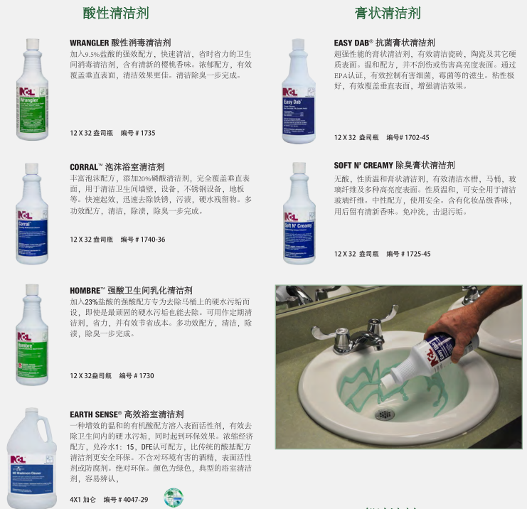 干凈、衛(wèi)生的衛(wèi)生間反映了設(shè)施的整體清潔程度。NCL的衛(wèi)生間清潔系統(tǒng)提供了最先進(jìn)的清潔、消毒和除臭產(chǎn)品,以確保最大功效的控制衛(wèi)生間環(huán)境中致病細(xì)菌。對(duì)于地板,墻壁,和其他表面,你也會(huì)找到一個(gè)更完整的程序。健康 經(jīng)濟(jì) 的清洗方案可以選擇適合清潔人員使用的化學(xué)輸送系統(tǒng)。低成本的傳統(tǒng)包裝提供最大的靈活性。稀釋控制管理系統(tǒng)提供稀釋狀態(tài)下各種各樣的產(chǎn)品,以達(dá)到最佳效果。